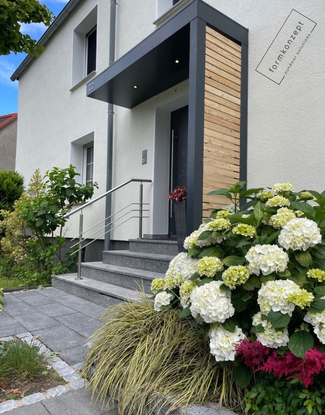 Setzen Sie ein Statement. Unsere kubischen Vordächer ohne sichtbare Dachneigung passen perfekt zu moderner Architektur. In Kombination mit Seitenteilen aus Glas oder Holzlamellen schaffen wir einen geschützten, einladenden Eingang.